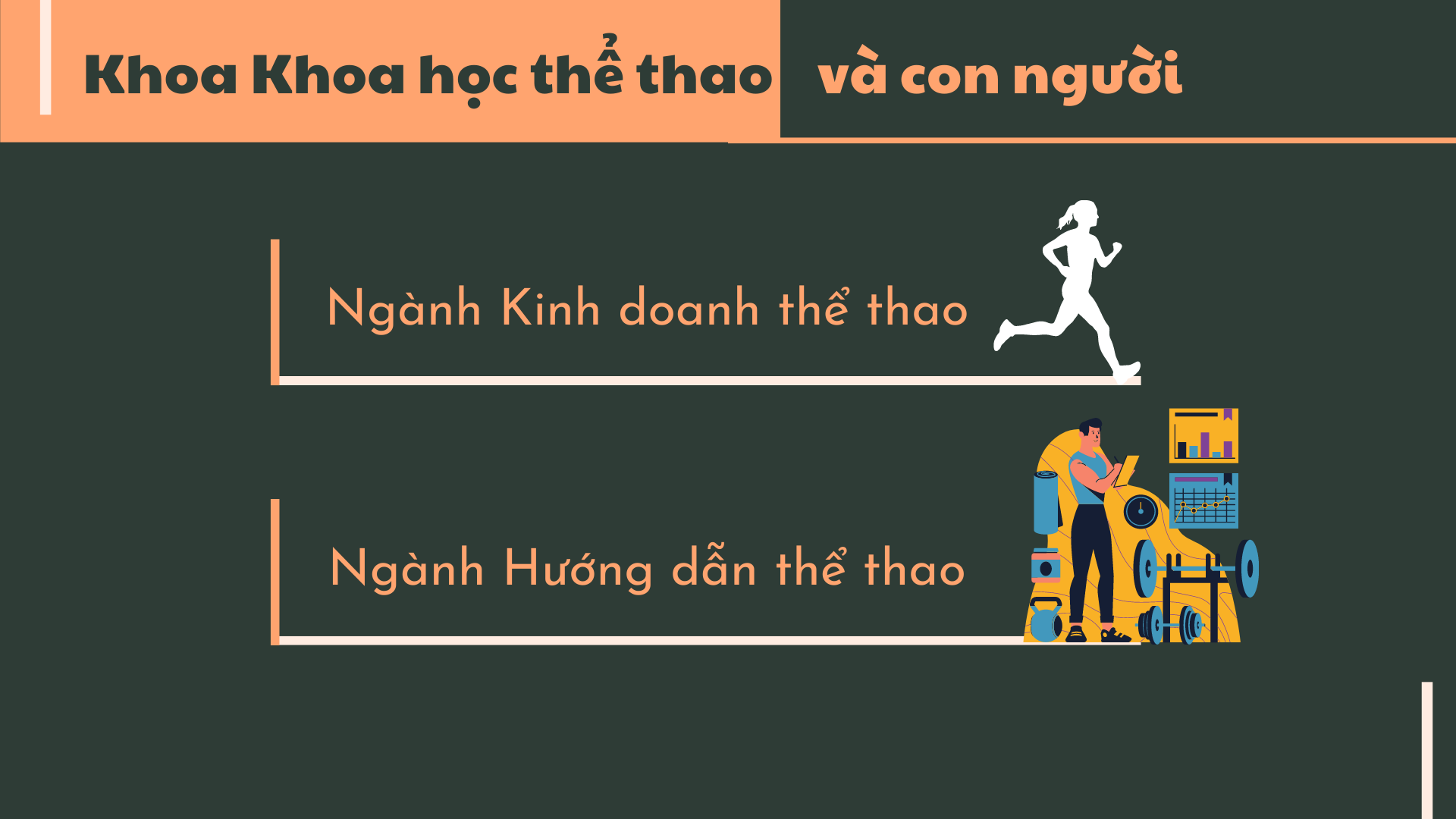 Đào tạo nhân lực hoạt động tại hiện trường thể thao thông qua việc học tập đa dạng không chỉ kiến thức liên quan đến thể thao, mà còn học về kinh doanh học, quản lý, huấn luyện cần thiết để làm một người hướng dẫn, quản lý sức khỏe.